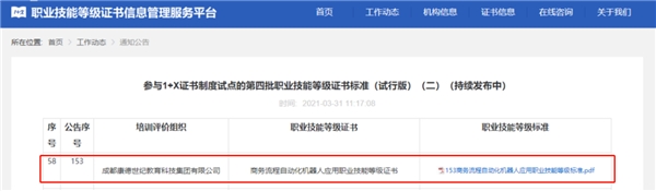 自楷柏財(cái)經(jīng)研發(fā)并由其母公司康德教育集團(tuán)申報(bào)的《商務(wù)流程自動(dòng)化機(jī)器人應(yīng)用》職業(yè)技能等級(jí)標(biāo)準(zhǔn)及其證書獲批教育部第四批1+X證書制度試點(diǎn)以來,憑借行業(yè)領(lǐng)先的證書標(biāo)準(zhǔn)、注重實(shí)操應(yīng)用的課程特色,受到企業(yè)雇主的廣泛認(rèn)可和好評(píng),并與全國(guó)多所職業(yè)院校達(dá)成合作,共同推動(dòng)RPA技能人才培養(yǎng)。