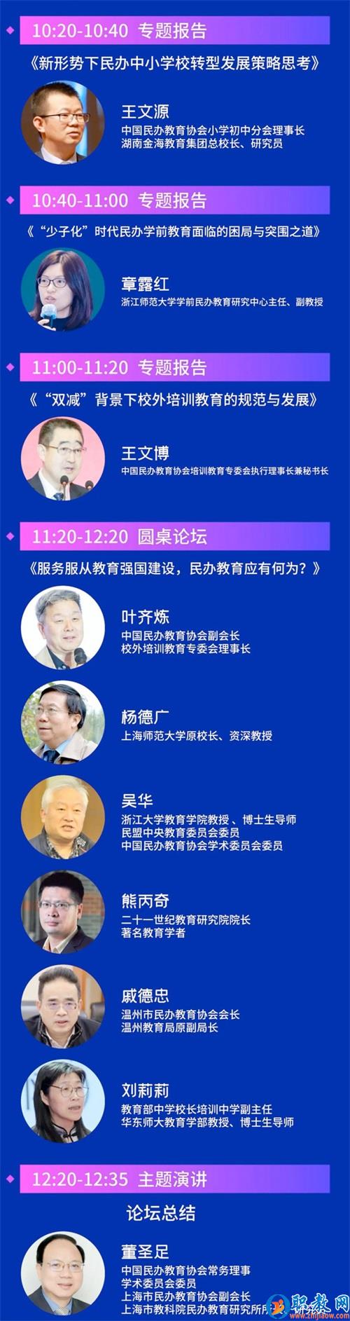 亮點(diǎn)劇透 【行業(yè)趨勢(shì)解讀】 教育領(lǐng)域的權(quán)威專家深度解讀教育強(qiáng)國(guó)建設(shè)下民辦教育的政策走向及發(fā)展前景展望,為民辦教育發(fā)展提供精準(zhǔn)的政策導(dǎo)向與市場(chǎng)洞察,助力民辦教育機(jī)構(gòu)穩(wěn)健前行,把握發(fā)展先機(jī)。 【多維案例剖析】 從民辦高等教育、民辦中小學(xué)校、民辦學(xué)前教育、校外培訓(xùn)教育等不同教育階段和領(lǐng)域,全面且深入地探討新階段民辦教育各領(lǐng)域的發(fā)展策略與問題解決之道。學(xué)習(xí)如何在復(fù)雜多變的環(huán)境中制定適應(yīng)性策略,推動(dòng)教育質(zhì)量與效能的雙重提升。 【跨界智慧交融】 不同背景、不同視角的觀點(diǎn)碰撞與交流,共同探討民辦教育在教育強(qiáng)國(guó)建設(shè)中的角色與使命,碰撞出創(chuàng)新的解決方案與合作機(jī)會(huì)。 【專業(yè)洞察賦能】 以專業(yè)的視角提煉前瞻性的政策建議與行業(yè)指南,為未來民辦教育的發(fā)展提供方向和指引,助力民辦教育機(jī)構(gòu)在新時(shí)代背景下找準(zhǔn)定位,實(shí)現(xiàn)高質(zhì)量發(fā)展。