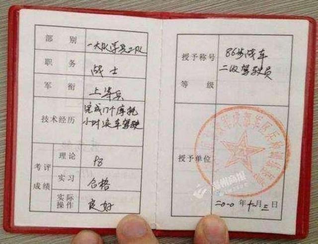 我們只知道開車要駕駛證,其實(shí)駕駛坦克也是要坦克駕駛證的!坦克駕駛證屬于“結(jié)業(yè)證”,是由中國(guó)人民解放軍授予的裝甲兵專業(yè)技術(shù)等級(jí)證書,軍人某項(xiàng)專業(yè)技術(shù)的經(jīng)歷、考評(píng)和等級(jí)等內(nèi)容都在上面得到體現(xiàn)。