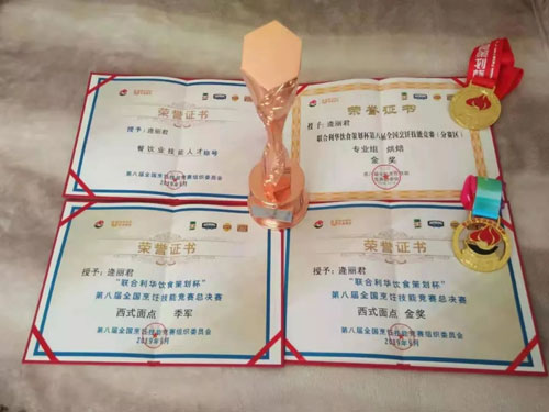 頒獎(jiǎng)現(xiàn)場(chǎng),當(dāng)聽(tīng)到自己榮獲“全國(guó)烹飪技能競(jìng)賽西式面點(diǎn)季軍”、“西式面點(diǎn)金獎(jiǎng)”,并被授予“餐飲業(yè)技能人才”稱(chēng)號(hào)時(shí),我心里激動(dòng)不已。接過(guò)獎(jiǎng)杯,激動(dòng)的淚水在眼圈里打轉(zhuǎn),因?yàn)槲抑肋@個(gè)獎(jiǎng)杯來(lái)之不易!