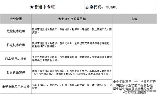 普通中專:數(shù)控技術(shù)應(yīng)用、模具制造技術(shù)、機(jī)電設(shè)備安裝與維修(電梯安裝與維修)、機(jī)電技術(shù)應(yīng)用、電子電器應(yīng)用與維修、國際商務(wù)、計算機(jī)及應(yīng)用。