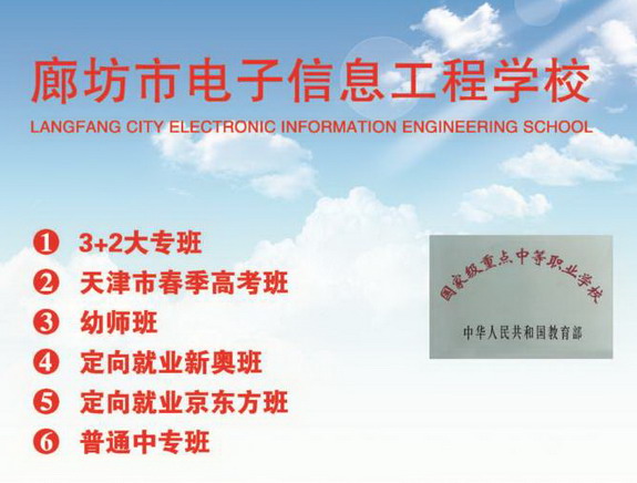 相關(guān)學(xué)校鏈接: 保定新興工業(yè)技工學(xué)校招生簡章 保定華中技工學(xué)校-保定華中技校招生簡章 中國輕工機電工程學(xué)校 中國輕工集團高級技工學(xué)校招生簡章 廊坊市電子信息工程學(xué)校,又名廊坊市職業(yè)技術(shù)教育中心,是集普通中專、五年一貫制大專和各類短訓(xùn)班為一體的國家級重點中等職業(yè)學(xué)校。 學(xué)校設(shè)有汽車電子技術(shù)應(yīng)用、汽車運用與維修、電氣技術(shù)應(yīng)用、電子與信息技術(shù)、電子技術(shù)應(yīng)用、計算機應(yīng)用、計算機動漫與游戲制作、會計電算化、電子商務(wù)、物流服務(wù)與管理、旅游服務(wù)與管理、學(xué)前教育12個專業(yè)。 合作企業(yè)多:電子信息類專業(yè)以世界500強的華為、北京京東光電科技有限公司、諾基亞(中國)..