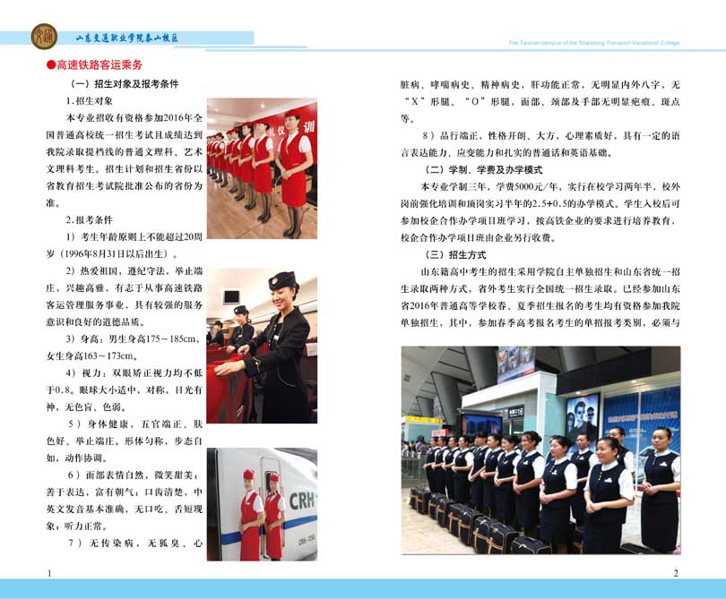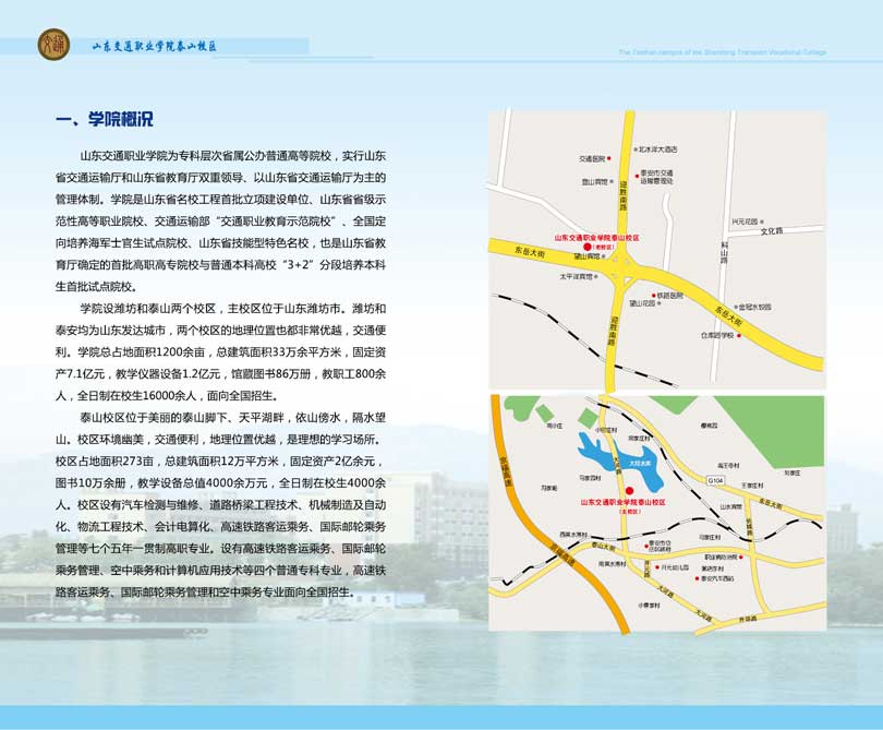 山東交通職業(yè)學(xué)院創(chuàng)建于1973年,是山東省交通運(yùn)輸廳直屬的公辦全日制普通高等學(xué)校,實(shí)行山東省交通運(yùn)輸廳和山東省教育廳雙重領(lǐng)導(dǎo)的管理體制。學(xué)院總占地面積1300余畝,總建筑面積45萬平方米,全日制在校生15000余人。館藏圖書79余萬冊(cè),開設(shè)專業(yè)32個(gè)。學(xué)院現(xiàn)有教職工800余人,其中,國務(wù)院特殊津貼獲得者1名,全國交通高等職業(yè)教育專業(yè)帶頭人3名,省級(jí)教學(xué)團(tuán)隊(duì)3個(gè),省級(jí)教學(xué)名師5名,博士8人,碩士276人,教授8人,副高級(jí)職稱及以上教師203人。 山東交通職業(yè)學(xué)院泰山校區(qū)(原山東省交通運(yùn)輸學(xué)校)始建于1983年。泰山校區(qū)位于美麗的泰山腳下—泰安市,設(shè)東、西兩個(gè)校區(qū),主校區(qū)位于天..