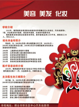媚思嘉美容美發(fā)化妝培訓(xùn)學(xué)校簡介 媚思嘉美容美發(fā)化妝培訓(xùn)學(xué)校是經(jīng)勞動部門批準(zhǔn)成立的一所正規(guī)的技能培訓(xùn)學(xué)校,并被市總工會、共青團(tuán)市委、勞動和社會保障局聯(lián)合指定為下崗職工、待業(yè)青年再就業(yè)及陽光工程培訓(xùn)基地。為培訓(xùn)更多的美容、美發(fā)、化妝技能者,為解決更多的待業(yè)青年、下崗職工的就業(yè)問題,我們長期開設(shè)學(xué)習(xí)班,條件優(yōu)越,師資力量雄厚,特聘高級講師10名,秉承新教學(xué)理念,開拓美容美發(fā)教學(xué)新典范。 媚思嘉美容美發(fā)化妝培訓(xùn)學(xué)校環(huán)境優(yōu)雅交通方便,備有食宿,擁有高標(biāo)準(zhǔn)教學(xué)樓和先進(jìn)的電教設(shè)備,媚思嘉美容美發(fā)化妝培訓(xùn)學(xué)校還在市周邊地區(qū)開設(shè)免費的實習(xí)基地,為學(xué)生創(chuàng)造好..