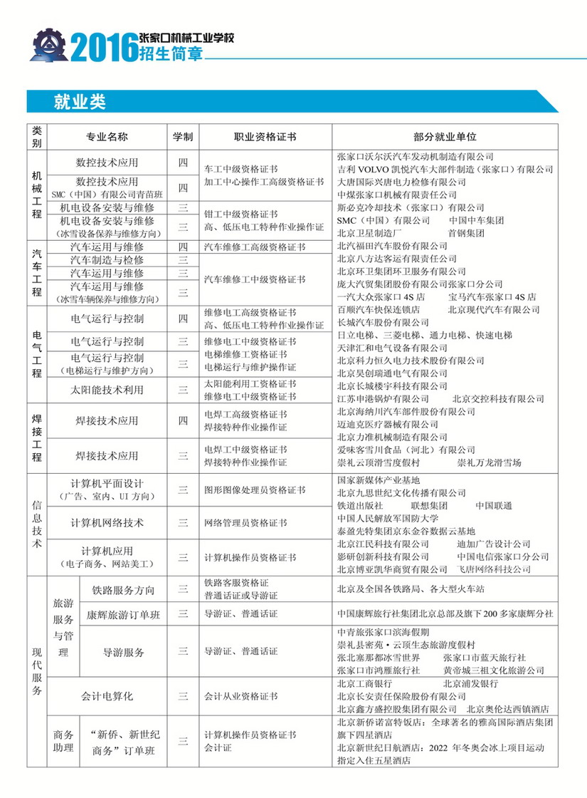 張家口機械工業(yè)學(xué)校是一所國家級重點中等職業(yè)學(xué)校、技師學(xué)院。多年來秉承“錘煉技術(shù)、鍛造品格”八字校訓(xùn),優(yōu)化育人環(huán)境,提高辦學(xué)質(zhì)量,已成為華北地區(qū)機械加工制造類技能人才重要育人基地。 學(xué)校現(xiàn)占地255畝,在校生5500人,教職工423人,“雙師型”教師百余人;省級名師1人,省新世紀“三三三”人才第三層次人選3人,省技術(shù)能手1人,省級學(xué)科帶頭人2人,師資力量雄厚,辦學(xué)實力強勁。 學(xué)校始終堅持“以服務(wù)為宗旨、就業(yè)為導(dǎo)向、能力為本位”的職業(yè)教育指導(dǎo)思想,以“培訓(xùn)一人、就業(yè)一人、脫貧一戶、造福一方”為培養(yǎng)目標(biāo),工學(xué)結(jié)合培養(yǎng)人才,學(xué)生在各級各類技能大賽屢次獲獎。與..