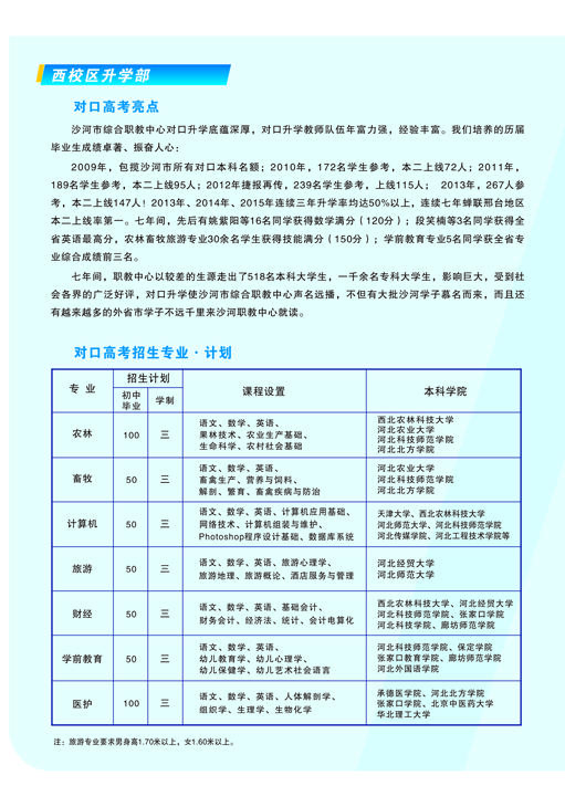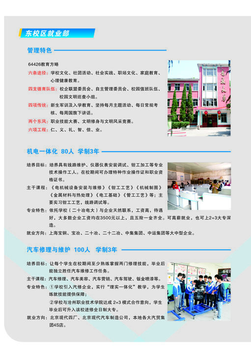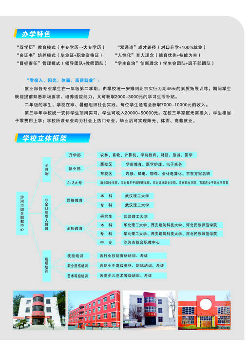 河北省沙河市綜合職教中心介紹 河北沙河市綜合職教中心始建于1995年,2011年7月沙河市人民政府將原二十冶技校(含邢臺(tái)機(jī)械電子工程學(xué)校)、原沙河市衛(wèi)生學(xué)校合并到沙河市綜合職教中心。 整合后的職教中心以“先搭建框架,再豐滿血肉”為辦學(xué)思路,通過(guò)開(kāi)展多資質(zhì)、多層次、多形式、多類(lèi)別辦學(xué),逐步構(gòu)建起全日制學(xué)歷教育、成人教育和職業(yè)培訓(xùn)并舉的立體職教框架,形成了學(xué)歷教育與職業(yè)培訓(xùn)規(guī)模大體相當(dāng),全日制中職教育與成人教育規(guī)模大體相當(dāng)、升學(xué)教育與就業(yè)教育規(guī)模大體相當(dāng)?shù)霓k學(xué)格局。 河北省沙河市綜合職教中心占地99101平方米(148.6畝),分為東、西兩個(gè)校區(qū),總建筑面積為..