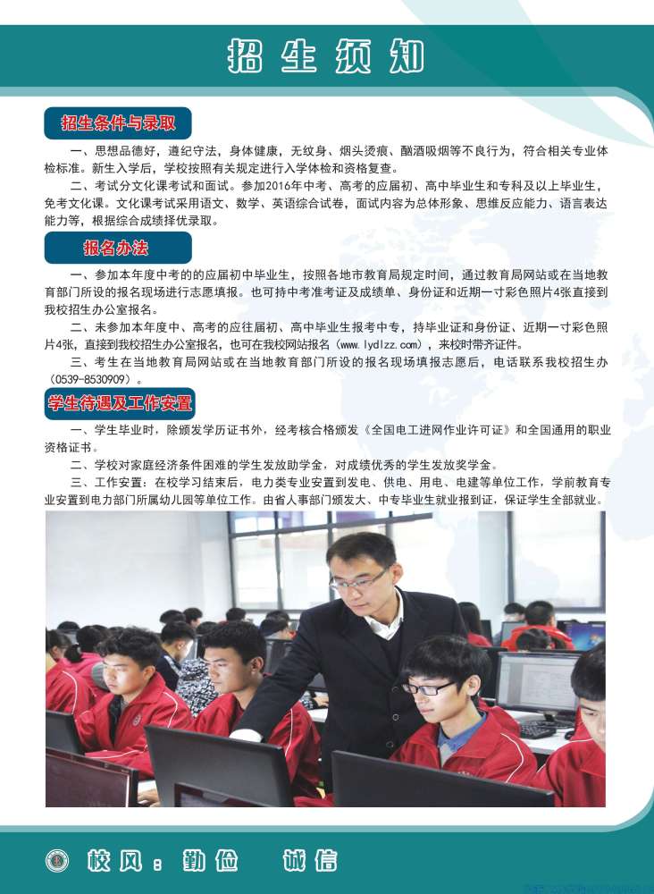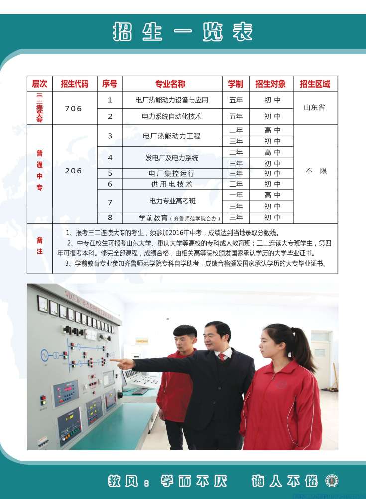 國家級(jí)重點(diǎn)學(xué)校 山東省高水平學(xué)校 一、臨沂電力學(xué)校概況 臨沂電力學(xué)校始建于1993年,系國家級(jí)重點(diǎn)學(xué)校、山東省示范性中職學(xué)校、山東省首批高水平中等職業(yè)學(xué)校、山東省首批五年制高等職業(yè)教育試點(diǎn)專業(yè)學(xué)校。在校生5100余人,學(xué)校規(guī)模和綜合實(shí)力在全國電力類中職學(xué)校中位居前列,是全國電力職業(yè)教育指導(dǎo)委員會(huì)委員單位。 學(xué)校專業(yè)特色鮮明。設(shè)有五年制高職(大專)和中專兩個(gè)辦學(xué)層次,設(shè)立就業(yè)班和高考班。開設(shè)熱能動(dòng)力工程技術(shù)、電力系統(tǒng)自動(dòng)化技術(shù)、電氣自動(dòng)化技術(shù)、新能源裝備技術(shù)、分布式發(fā)電與智能微電網(wǎng)技術(shù)、電廠集控運(yùn)行、火電廠熱力設(shè)備運(yùn)行與檢修、發(fā)電廠及變電站運(yùn)行與維護(hù)..
