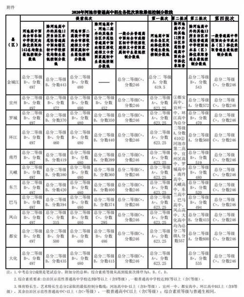 河池市教育局關(guān)于公布2020年河池市普通高中招生錄取最低控制分數(shù)線的通知 各縣(區(qū))教育局,市直各普通高中學(xué)校: 根據(jù) 2020年全市普通高中招生計劃、