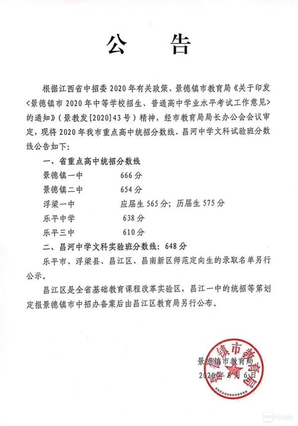 2020年江西景德鎮(zhèn)中考重點(diǎn)高中統(tǒng)招分?jǐn)?shù)線公布