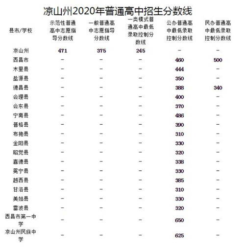2021年四川涼山中考錄取分?jǐn)?shù)線暫未公布,小編為大家整理了2020年分?jǐn)?shù)線作為參考。2021年分?jǐn)?shù)線將在官方公布后進行更新,請大家持續(xù)關(guān)注。 2020年分?jǐn)?shù)