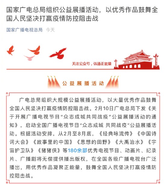 【#廣電總局免費(fèi)提供180部?jī)?yōu)秀節(jié)目#】 據(jù)國(guó)家廣電總局,日前已啟動(dòng)全國(guó)廣播電視節(jié)目“眾志成城 共同戰(zhàn)疫”公益展播活動(dòng)。根據(jù)安排,《大禹治水》《宇