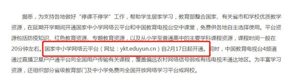 周知!國(guó)家中小學(xué)網(wǎng)絡(luò)云平臺(tái)2月17日開(kāi)通 教育部整合國(guó)家、有關(guān)省市和學(xué)校優(yōu)質(zhì)教學(xué)資源,在延期開(kāi)學(xué)期間開(kāi)通國(guó)家中小學(xué)網(wǎng)絡(luò)云平臺(tái)和中國(guó)教育電視臺(tái)空中
