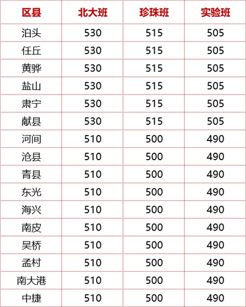 2020年河北滄州各縣市中考錄取分數(shù)線公布 滄州一中 錄取參考線(文化分) 1、滄州市區(qū) 北大班:542分 珍珠班:530 分 實驗班:以教育局公布為準 2、滄州