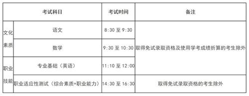 實(shí)行“文化素質(zhì)+職業(yè)技能”的評(píng)價(jià)方式,總分為750分。其中文化素質(zhì)考試科目為語(yǔ)文、數(shù)學(xué),每科150分,滿分300分,考試時(shí)間各60分鐘。職業(yè)技能考試分為專業(yè)基礎(chǔ)和職業(yè)適應(yīng)性測(cè)試兩部分內(nèi)容,專業(yè)基礎(chǔ)考試科目為英語(yǔ),滿分100分,考試時(shí)間50分鐘;職業(yè)適應(yīng)性測(cè)試考試科目分為綜合素質(zhì)和職業(yè)能力兩部分,分別占150分和200分,滿分350分,考試時(shí)間120分鐘。