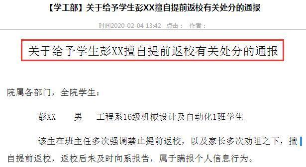 這2名學(xué)生在確認收到學(xué)校不得提前返校的通知后,仍然不顧省教育廳《關(guān)于2020年全省春季學(xué)期延期開學(xué)的通知》所明確的“所有學(xué)生不得提前返?!钡囊螅约皩W(xué)校相關(guān)管理規(guī)定,不聽勸阻,在當前嚴峻的疫情防控形勢下,擅自提前返校。